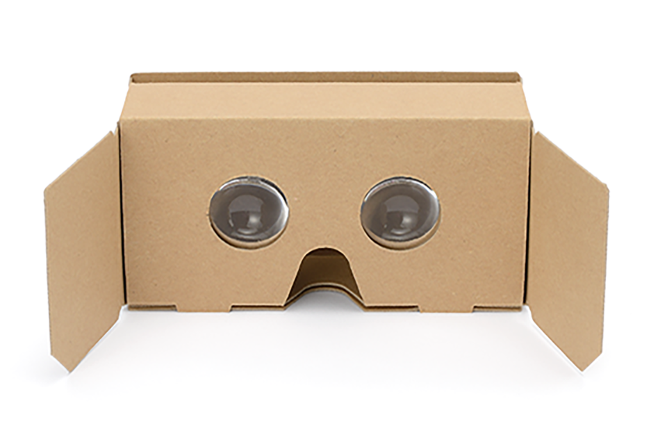 | ダンボールで作られた簡易HMD。スマートフォンをはめ込むだけで使える。 |